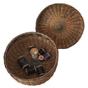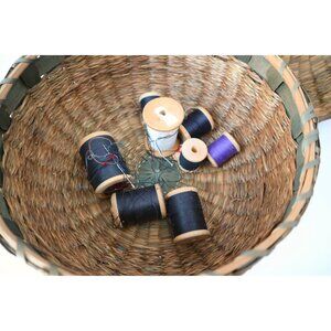 The large one is made out of wicker and does have some wear, at one time there may have been a handle and it comes with some wood thread spools. It measures 5" high by 9" wide.