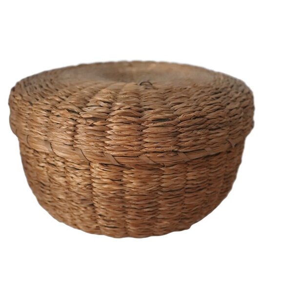 The smaller one is made out of palm leaves and is lined inside. It is in good condition with no holes, no lining does have a few spots on the material. It measures 3" high by 6" diameter.