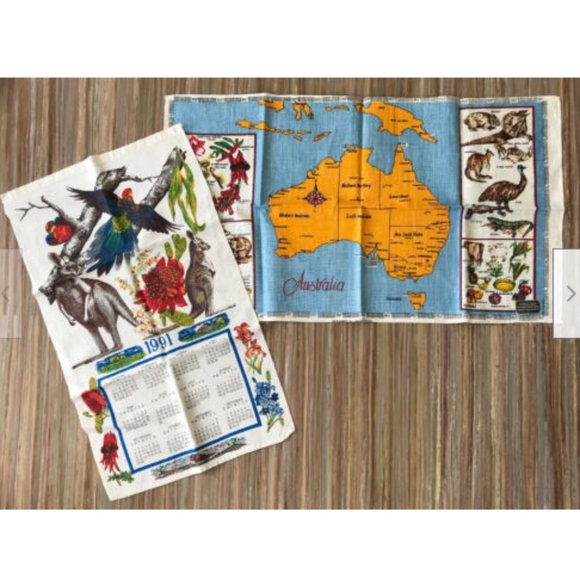 Set of 2 vintage kitchen towels from Australia. Both are pure linen fabric and are in excellent condition/appear unused. Map of Australia towel still has the sticker on the front corner, 18"x32". 1991 calendar kitchen towel has Australian wildlife design, 15 1/2" x 27".