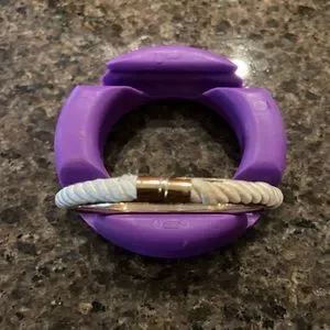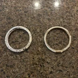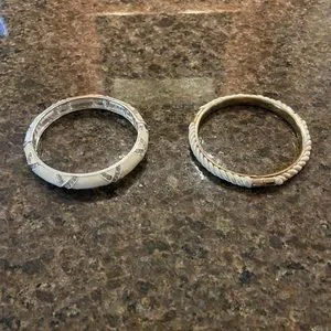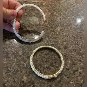 2 White Bangles in great condition One is hinged with silver accents. Other has gold tone areas on the white roping design. Both are 1mm thick