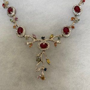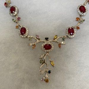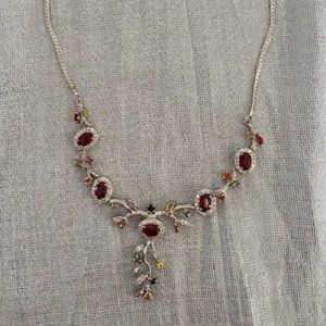 Gorgeous Multi-colored Gems including Red, Yellow, Orange, Green, Pink & Blue, therefore, you could wear this GORGEOUS necklace with virtually any color.