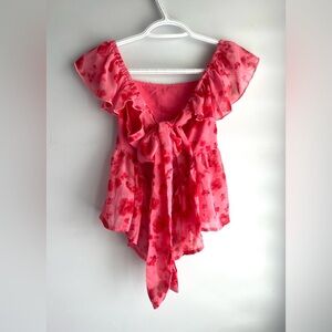 Elegant pink blouse with floral design. Features delicate ruffle accents. Ideal for a fashionable outfit.