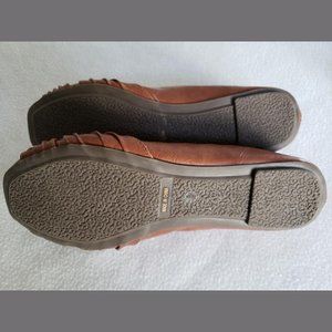 Brown flats, never worn and have a cute bow and pleated detail at front.