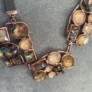 This is a gorgeous stone necklace by Bella Jack with grey leather. This is absolutely stunning some of the colours are grey, green, tan, gold and brown. looks like new only worn a few times. Not too heavy on neck. Claw clasp closure