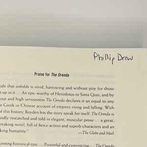 The Orenda is a 486 page historical novel by Canadian author Joseph Boyden. This multi-award winning Canadian bestseller was first published in 2014, as was this book's printing. This book is in excellent used condition; however, there is a name hand-written in ink on the first page as noted in the series of photos.