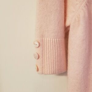 Le Chateau Baby pink short sleeve sweater, size large - has ribbed detail on cuffs and hem and button detail on cuffs. Scoop neck design.