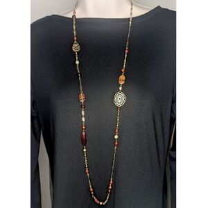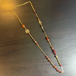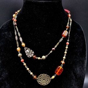 Beautiful signed Avon vintage station necklace. This exquisite necklace showcases a harmonious blend of gold and red/orange/amber coloured resin and acrylic elements (possibly lucite too) and filigree work on gold tone metal, creating a captivating piece that would enhance any ensemble. The intricate design and vibrant colors make it a standout accessory for all occasions. Can be worn long or layered (doubled or tripled).