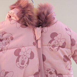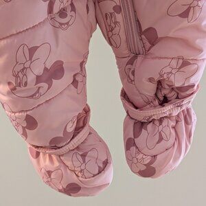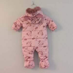 โ๏ธ Fit & Features: Pink puffer bunting snowsuit with Minnie Mouse pattern, fur trimmed hood and detachable booties.