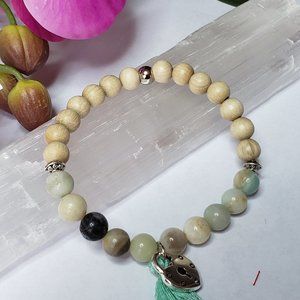 The "BLOCKING" Bracelet, Starring Amazonite beads & wood. Amazonite has a powerful filtering action. It blocks the earth's vibrations, absorbs microwaves and cell phone emanations, it also protects against electromagnetic pollution. This is an extremely soothing stone.