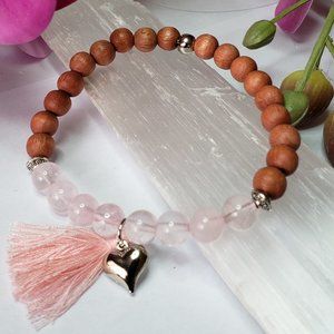 The "LOVE" Bracelet, Starring Rose Quartz beads & wood. Rose Quartz is the stone of unconditional love and infinite peace. It has a calming, reassuring energy and is also used for trauma or crisis. If you want love, look no farther than this romantic stone.