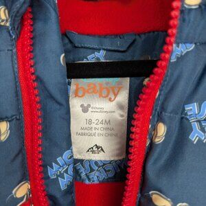 ✂️ Fit & Features: Navy blue Mickey Mouse puffer jacket with red fleece lining and attached hood with Mickey Mouse ears.