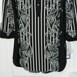 Details: This listing is for a NWT Nygard Black and White Paisley and Striped Pattern thin light jersey knit material "Crew Neck Half Button Up Pull Over Tunic" with 3/4 length sleeve in a size Small. Please note that Nygard cuts their garments a size larger than noted on the tag so a small fits like a medium. So on a smal slim frame this will fit very, very loose