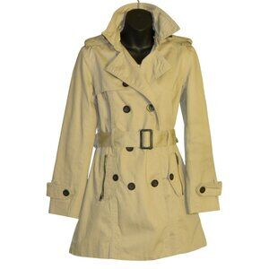 Details: This fitted trench coat jacket by American Eagle, comes with the matching belt and has 2 front zipper closing pockets and is in the peplum military button up front style; Belt is 62" L & 2" W.