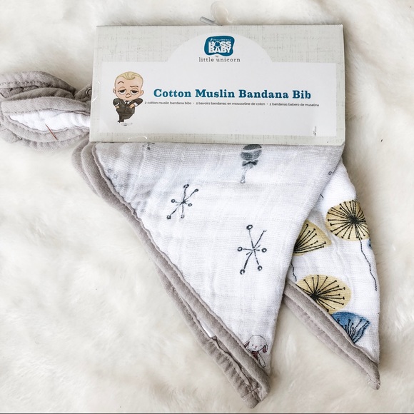 Little Unicorn x Boss Baby colab bob set. Two bibs. New in package. Small pulls/open threads in one section as shown in photos, does not affect use