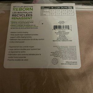 Repreve Polyster 65% Polyester 26% Elastane 9% medium control shaping. Wide double layered waste band shapes and supports tummy. Side seam free construction for all day comfort. Gusset is cotton lined. Reprove is the most trusted branded performance fibre made from 100% recycled materials including plastic bottles. The extra large fits the waist from 34-36 inches and the hip is 43-45 inches. New item. PLEASE, NOTE ALL SALES ARE FINAL.