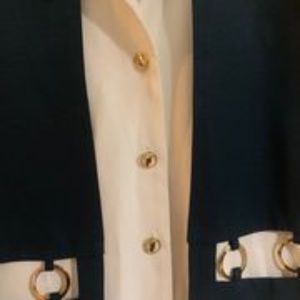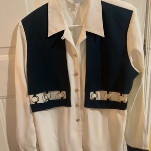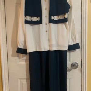 Very unique classy vintage pant suit. Nice brass color detail on ivory/navy color set. Tailored pleated pants, top is an all in one with attached contrasting panels hanging with look of a vest but drapes over button top. Very nice looking set.
