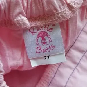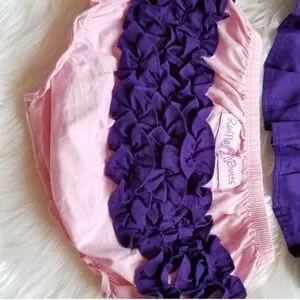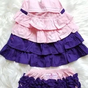 Charming 2 piece set with layered ruffles. Features a pink and purple color scheme. Perfect for special occasions.