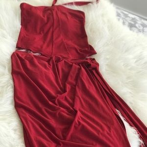 Two piece halter top and skirt with lots of stretch and clingy and all of the right places. Very flattering!