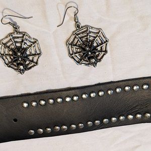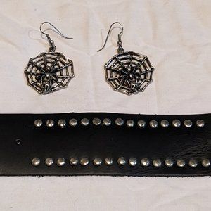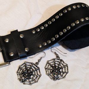 Heavy metal spider in web earrings Adjustable studded leather wrist cuff