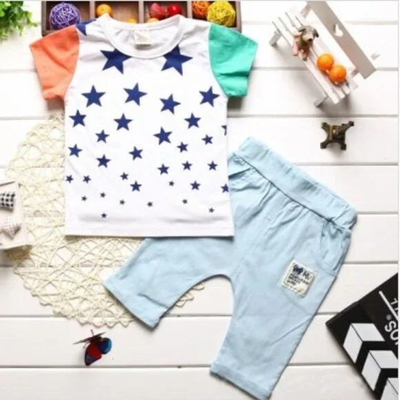 2 pieces set including a t-shirt and pants. Brand : Vogue Fashion. Fabric : Mixed cotton/polyester. Color : White print and blue. Size : 2.