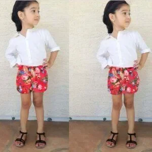 2 pieces set including a butonned shirt and a short with elastic waistband. Brand : Vogue Fashion. Fabric : Mixed cotton fibers. Color : White and fuchsia flower print. Size : 6-7.