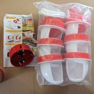 Turn a container or tote into a rodent free chicken feeder. Includes the circular tool needed to make the holes for your DIY Chicken feeders. This listing is for 2 sets of 8 piece kits; 16 total feeders. Prices much less than Amazon and other retailers.