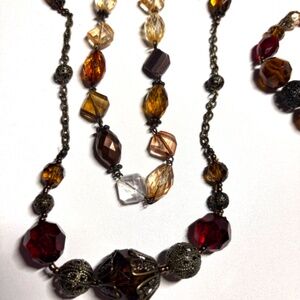 Beautiful contemporary set comprising two matching necklaces with geometric beads in shades of amber on brass-colored chains. Two pairs of hook earrings match the necklaces, as well as a stretch cord bracelet.