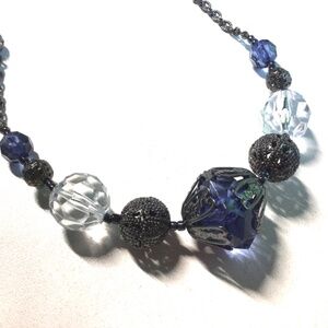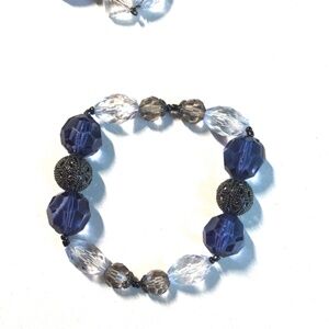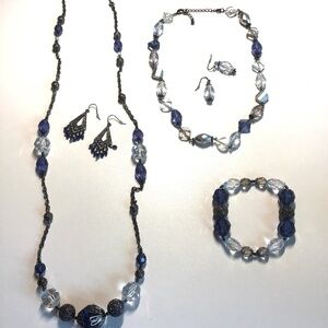 Beautiful contemporary set comprising two matching necklaces with geometric beads in shades of blue on smokey black chains. Two pairs of hook earrings match the necklaces, as well as a stretch cord bracelet.