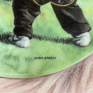 Artist is glen green known for his icon sports memorabilia portraits these 2 cute little plates are every family ran soccer home delight that can be a resemblance of anyone’s or even themselves as youth soccer plays having fun playing the sport they are in great condition no damages