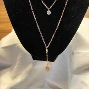 2 tiered chain necklace with faux amber, pearl drop, clear crystal,