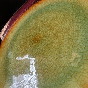 Green & Blue crackle center that fades to yellow & orange then to dark brown rim. The back has a matte finish.