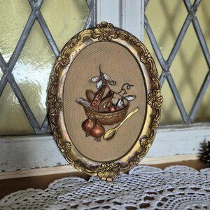 Vintage mid-century set of two oval chalkware still life wall hangings. Possibly a genuine peice of Girotti Sculptured Art (no sticker, seal, or signature). These three-dimensional castings of dark brown antique frames embellished with gold feature vegetables in a bowl and a kitchen utensil, witch are enhanced with gold and copper metallic paint. Perfect for adding a cottage core touch to your Fairy kitchen!