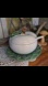 Whimsical white ceramic tureen shaped like an apple. Comes with a green leaf-patterned plate and a white spoon. Perfect serving dish for apple plum, for a fall vibe decor or for a Fairy pool party!