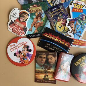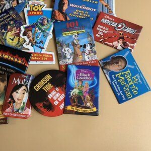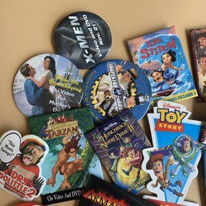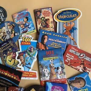 A unique and colorful collection of 20 vintage promotional video store button pins from iconic Disney movies and other popular films. These signs were originally used to advertise VHS and DVD releases in the late 1990s and early 2000s. A perfect addition for collectors or retro movie enthusiasts!
