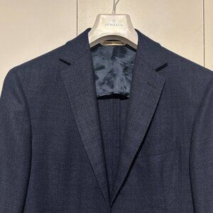 The jacket is unstructured, features patch pockets, a notch lapel and is double vented. The fabric is a beautiful textured navy blue wool. Features surgeon's cuffs (working buttonholes). Made in Italy by Maurizio Baldassari for Harry Rosen.