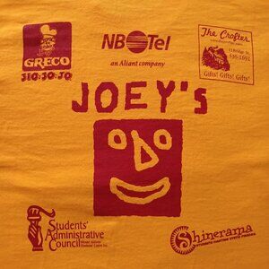 Shirt is in great condition for its age. Rare frosh shirt was designed by Ross Screeprint in Antigonish, Nova Scotia and includes advertisements for various Mount Allison University sponsors. Shirt sports an era specific "Made in Canada" Fruit of the Loom neck tag. What you see is what you get. Item is sold AS IS.