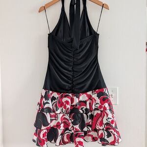 Elegant halter dress with a fitted black bodice. Features a vibrant red and white floral skirt. Perfect for special occasions.