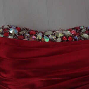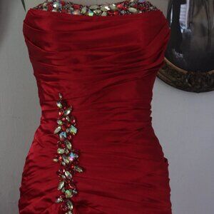 2000's Y2K Tony Bowles Red Satin Rhinestoned High Slit Satin Evening Gown Prom