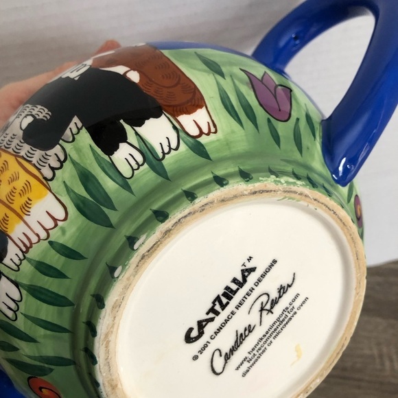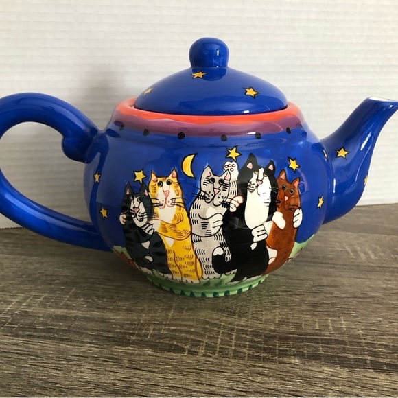 Charming teapot with hand painted cat design. Bright royal blue with star accents. Perfect for tea lovers and cat lovers.