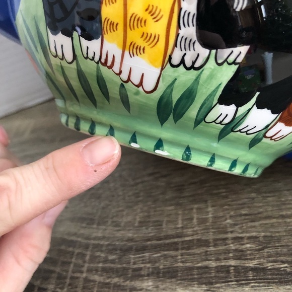 Excellent preloved condition- no chips or cracks, there are a couple spots along the rim that are missing colour but they are glazed over so that would indicate that they simply missed colour during the manufacturing process and is not damage after the fact. Some light crazing. Inside is very clean and stain free.