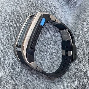 The case, band, crystal, and display are in perfect condition. Stainless steel and black plastic.