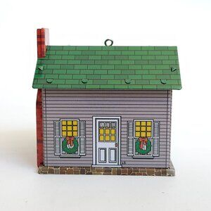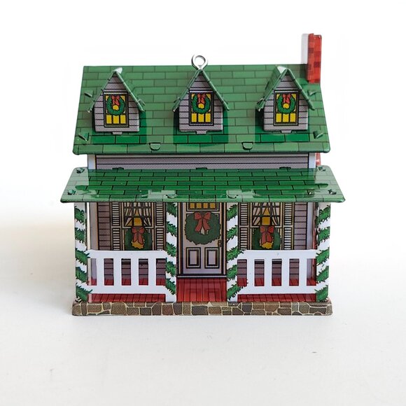 The ornament depicts a quaint house with a green roof, decorated for Christmas, and a matching covered bridge.