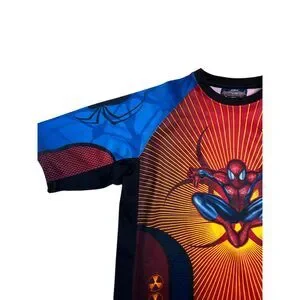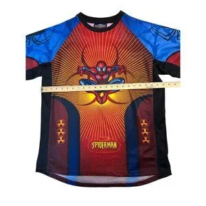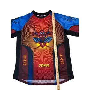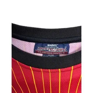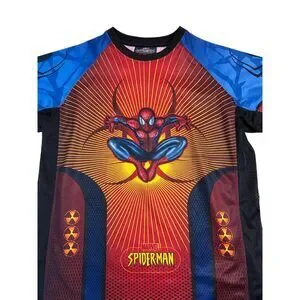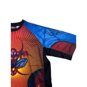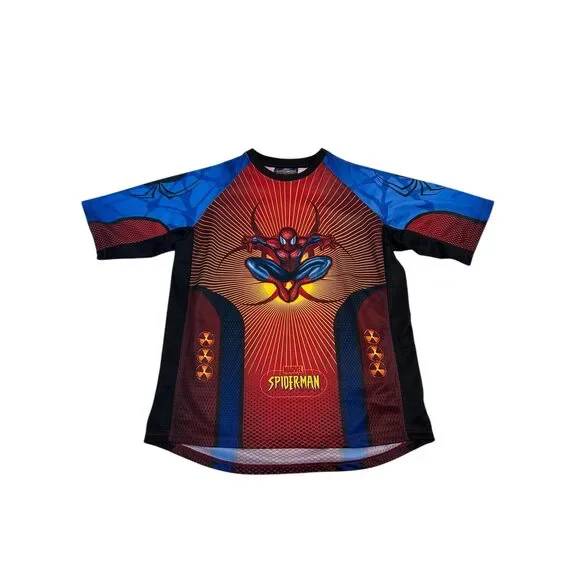 Eye-catching all-over print Spider-Man tee featuring a dynamic full-front graphic of Spider-Man. Athletic-style construction with mesh paneling and bold color blocking gives this shirt a jersey-inspired feel. Perfect for Marvel fans, superhero collectors, or anyone into statement graphic tops.
