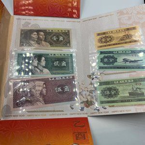 Vintage China Zodiac 2005 Year of the Rooster, banknote & coin commemorative collection set in a beautifully decorated red "Happy New Year" tri-fold card with Roosters, birds, flowers, Chinese men and lettering throughout the different flaps of the card. There are 6 banknotes and 6 coins. The notes come in several colors, brown, green, purple, yellow . Most coins are silver-tone, and 1 is gold-tone, they are marked with different years, from 1983 to 2004 (also unknown if any of these items have any actual monetary value). New, uncirculated, in original packaging (see photos for condition).