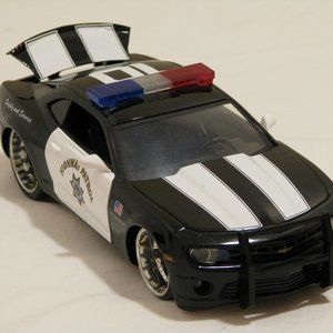 This is a Discontinued 96089 Jada Toys Heat - 2010 Chevy Camaro SS Police Car. 1:24 scale diecast collectible model car. This Chevrolet Camaro Highway Patrol car is an 8.25"Lx 3.25"Wx 2.25"H die cast model car with openable hood, doors & trunk, details engine. The 2010 Chevy Camaro is manufactured by Jada Toys. 96089 is in BLACK color with White doors & White stripes on hood & trunk.