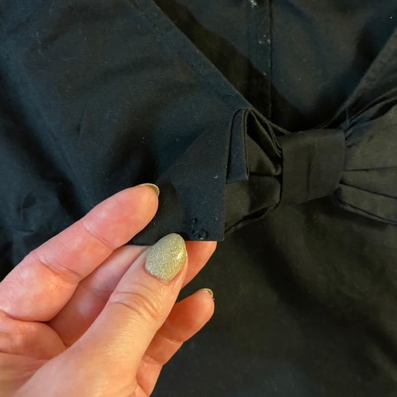 A very 2010's, dressy black tank top from H&M. Size 4, form fitting, cute bow on the chest. The top tips of the bow were previously tacked to the top, see photos. Can be easily tacked back on. Side zip. 71% cotton, 25% polyester, 4% elastane. Can be worn casually or business casual.