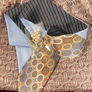 β¨ Custom Upcycled Silk Tie Scarf β Braided and wrapped in powder blue & gold geometric prints for a unique, vintage-meets-modern vibe.