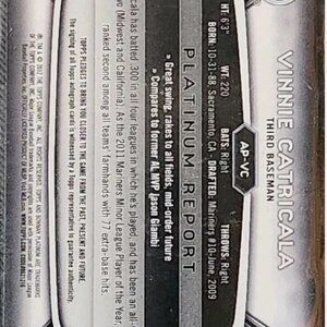 Step up to the plate with the 2012 Bowman Platinum Vinnie Catricala Prospect Autographs card #AP-VC. Featuring the up-and-coming Seattle Mariners talent, this card is a must-have for collectors and fans alike. The sharp, crisp imagery captures Catricala in mid-swing, poised for a potential home run.