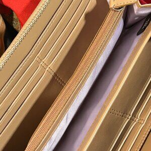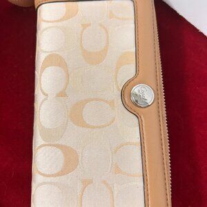 ✨ Classic Coach Wallet – A signature monogram zip-around wallet in tan & cream, blending seamlessly with the bag for a polished, put-together look.