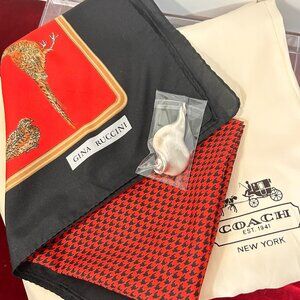 ✨ Vintage Gina Ruccini Scarf – A bold red & black houndstooth print with equestrian & bird motifs, adding a high-fashion, vintage flair.